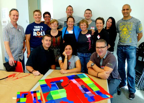 On October 19th Prospect’s Studio C welcomed The Fringe – a full-service salon in Calgary’s southwest. (Jo-Anne Dicken, the owner, is a nominee for the Alberta Women Entrepreneurs 2015 Celebration of Achievement Award.) Our job coach has been working with The Fringe for some time, and has noticed how the staff constantly mentor and support each other. They are never too busy to help a colleague. They discuss methods, colour mixing, techniques, and take a genuine interest in each other’s lives. As an organization they will donate their time, expertise or services to support community events, Prospect or a favourite charity. So it was no surprise that they had a great time in their DEAMcanvas session. Thanks for being a DEAMemployer!